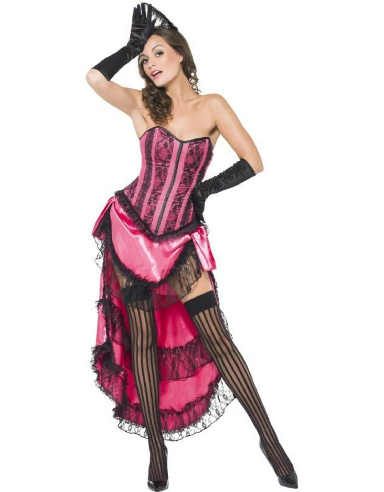 Dit kostuum bestaat uit een kanten korset, rok met lange achterkant, haarband