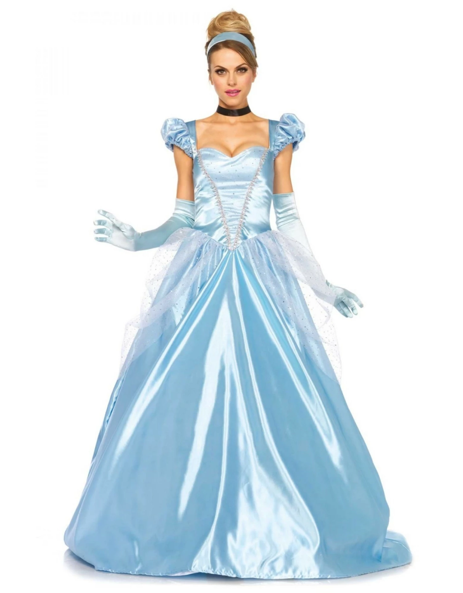 3-delig klassieke assepoester kostuum bestaat uit een lange satijnen jurk met glitter Tulle, satijnen choker en bijpassende haarband. Let op! De handschoenen worden niet meegeleverd.