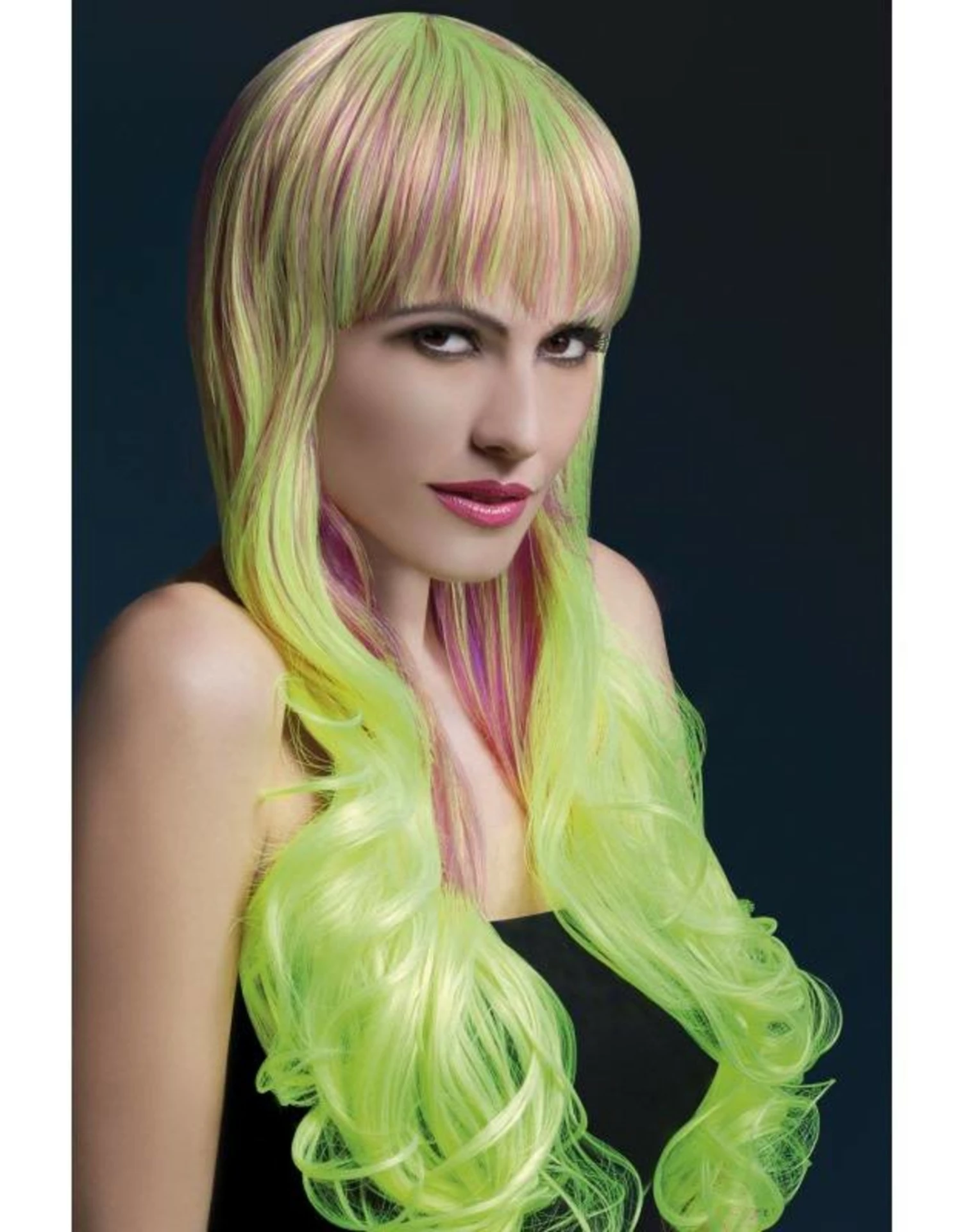 Lange paars/gele Fever Emily pruik met lichte slag en pony – 71 cm
