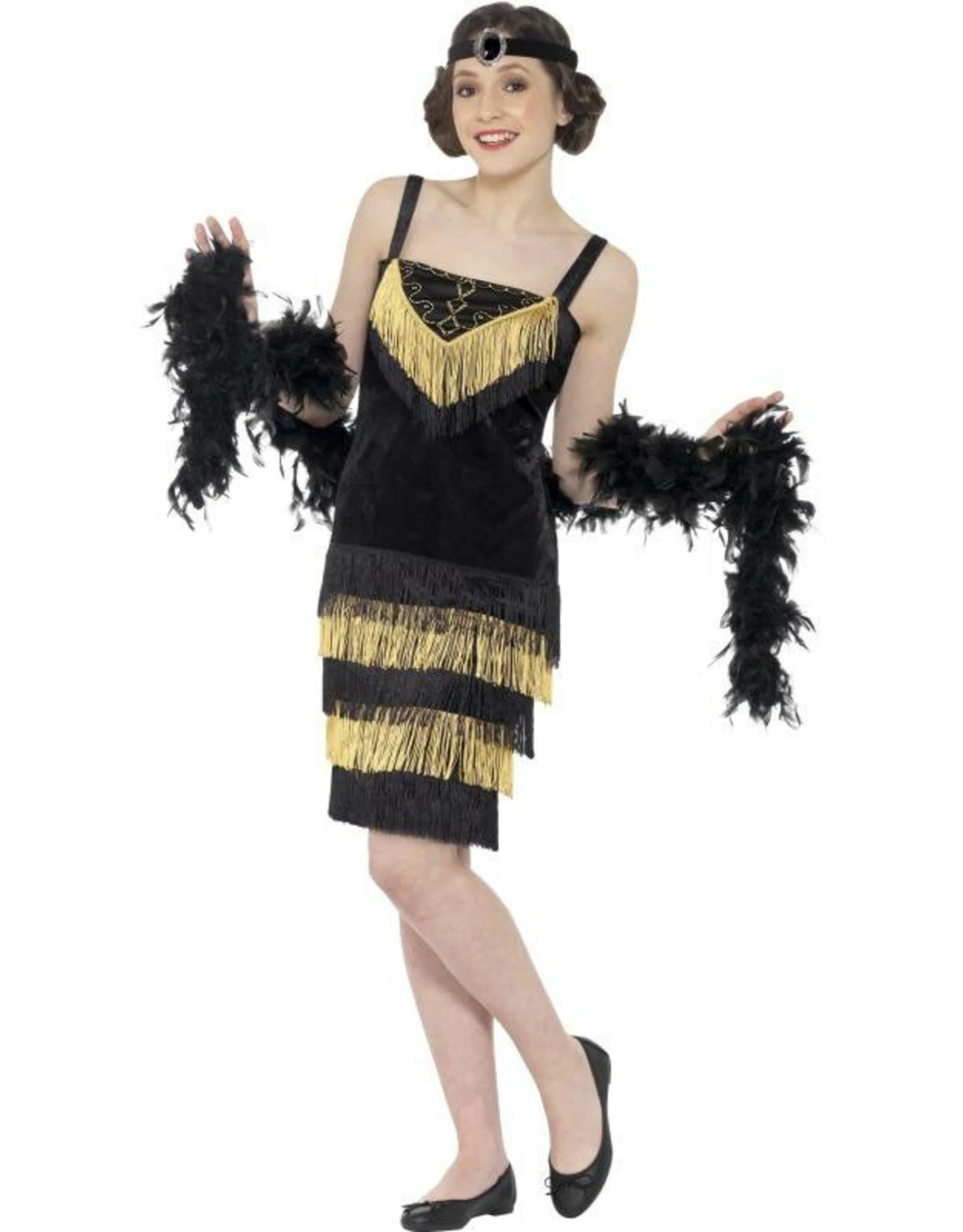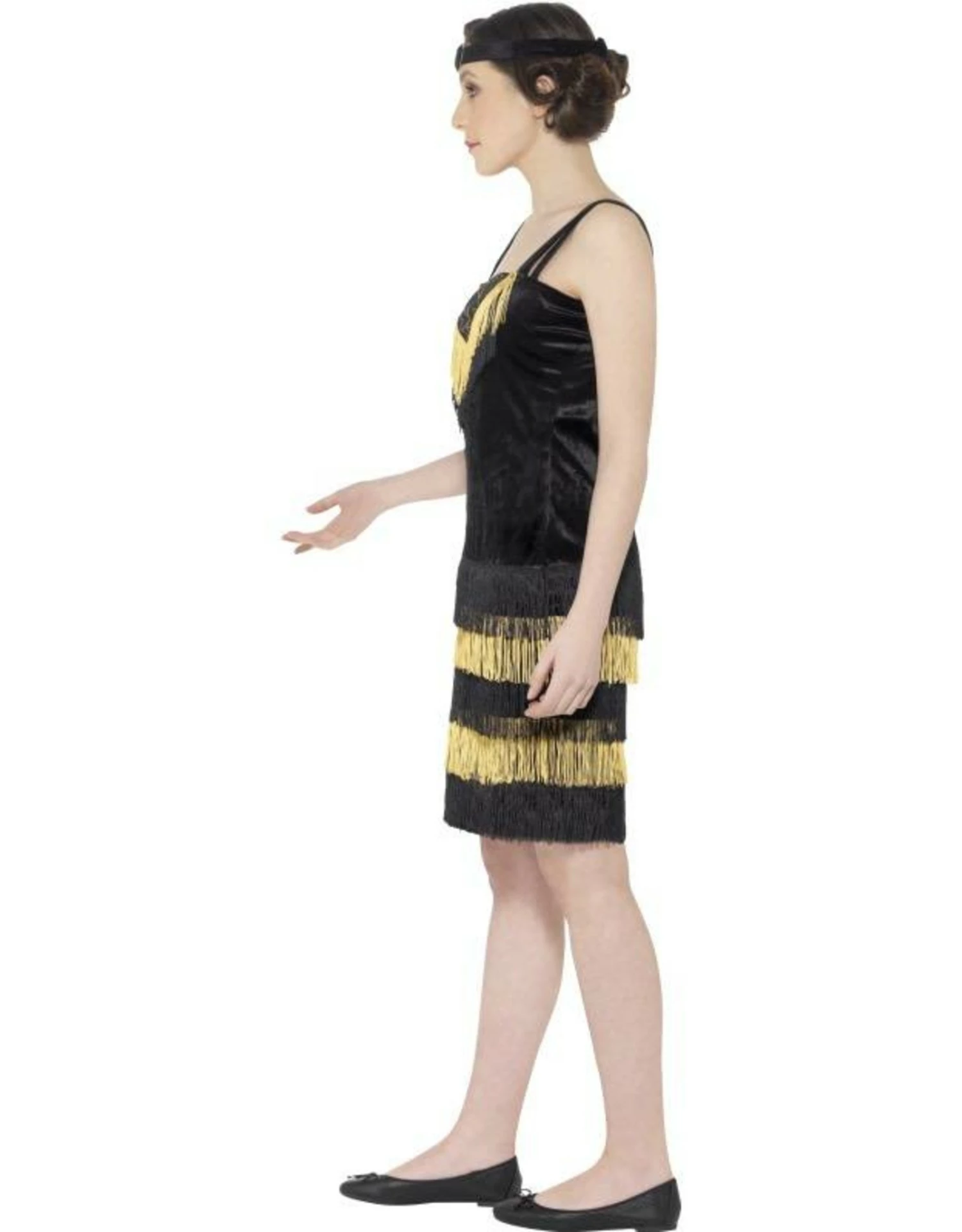 Dit kostuum bestaat uit een zwarte jurk met gouden accenten en haarband.