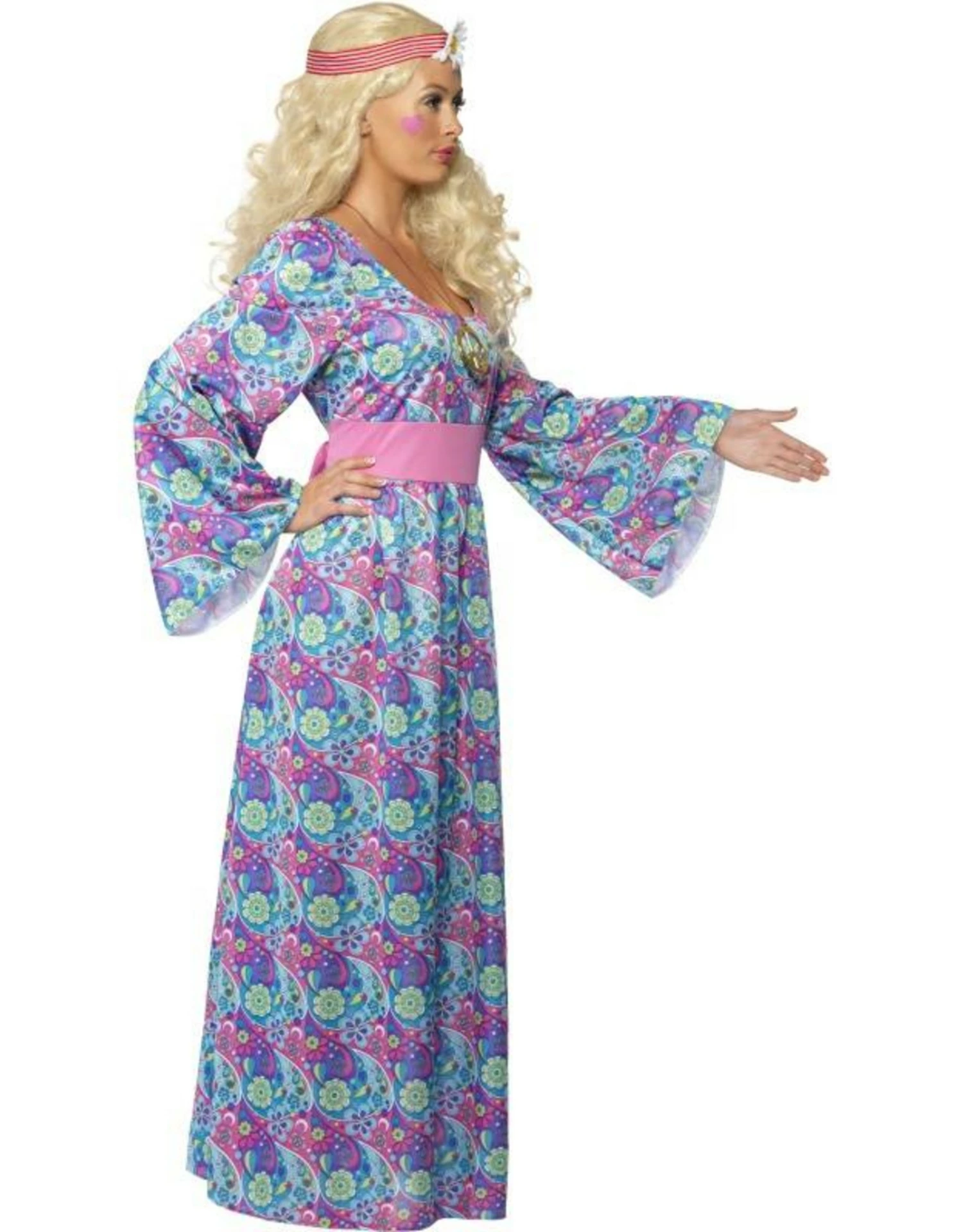 Dit kostuum betaat uit een lange jurk met wijde mouwen en sjerp.
