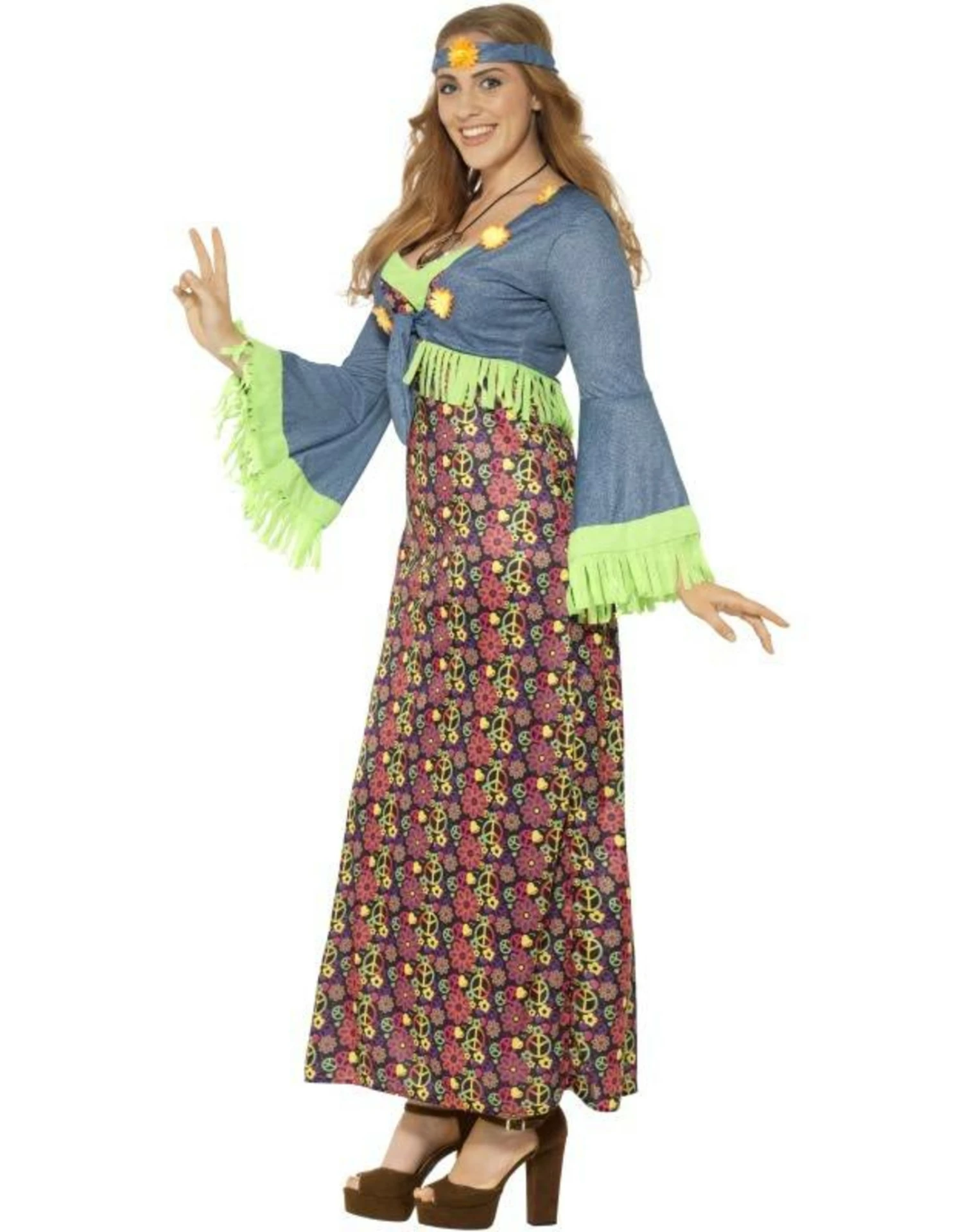 Dit kostuum bestaat uit een jurk met aangehecht spijkerkleurig jasje en haarband.