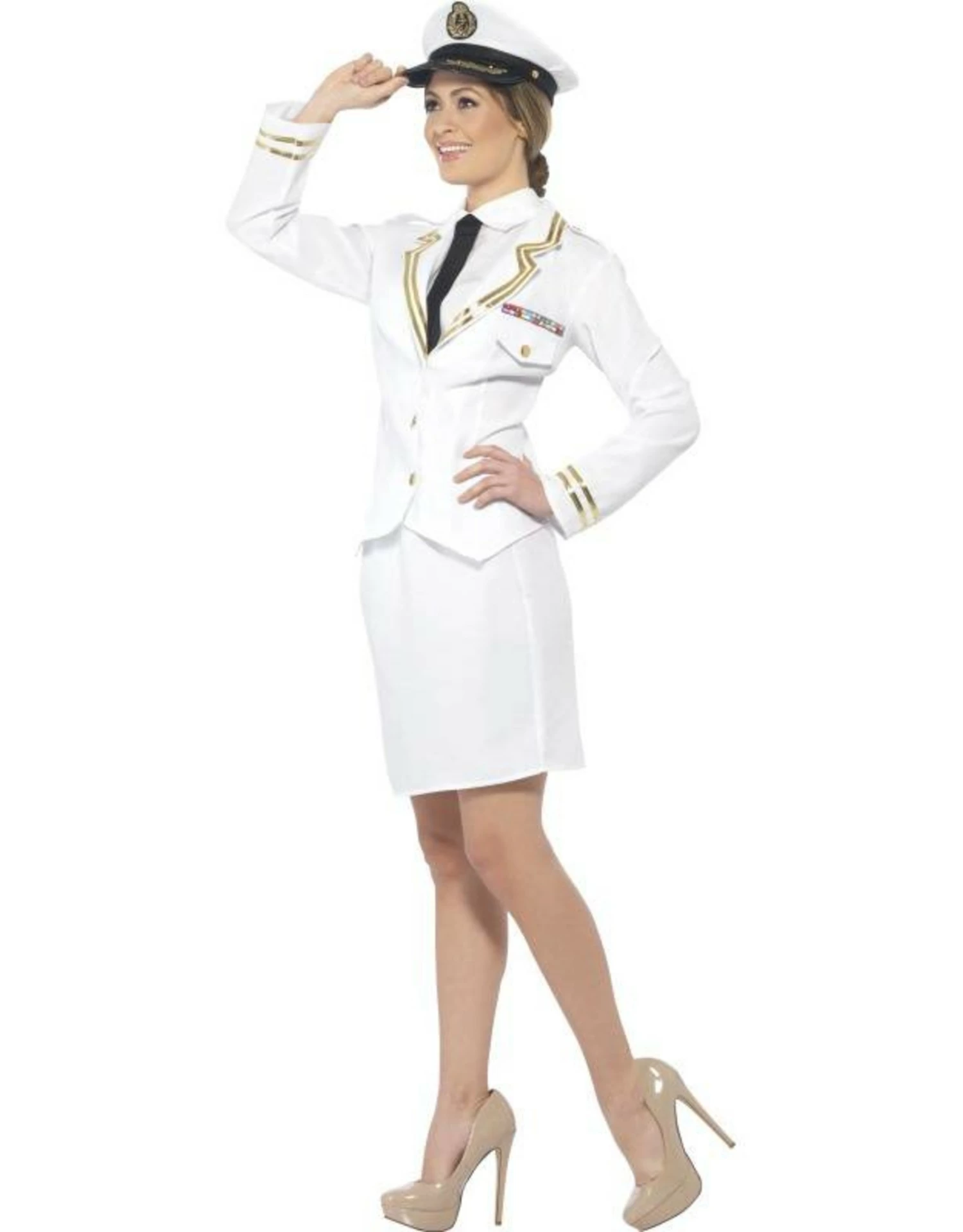 Dit kostuum bestaat uit een jasje met aangehechte blouse met stropdas, rokje en pet.