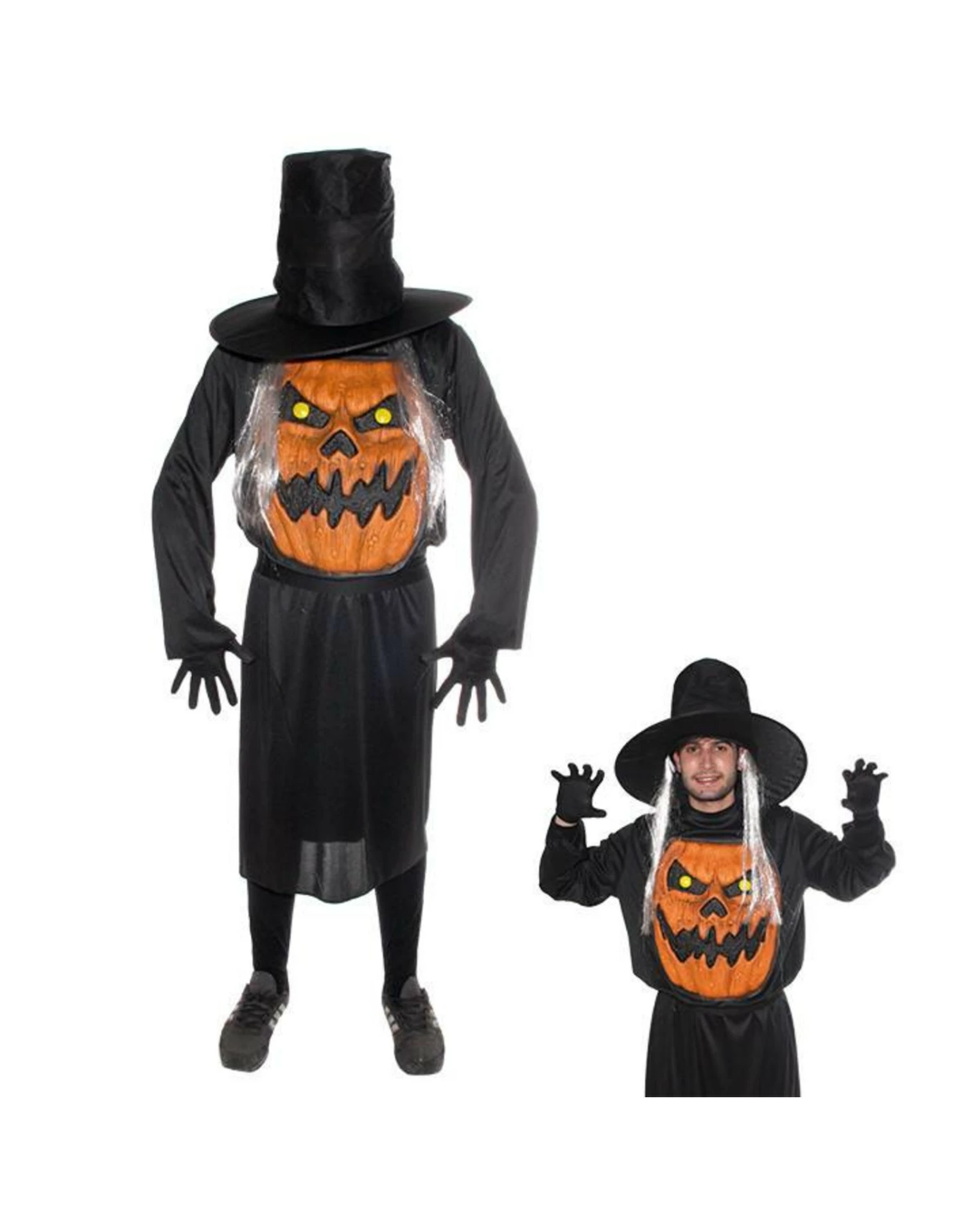Dit kostuum bestaat uit een gewaad, opgenaaid masker, hoed met haar en riem.